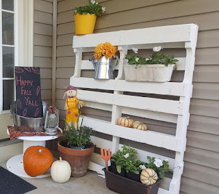 Hello Readers. How is your Autumn going? It is cooler and finally feels like "sweater-weather" where I live. I like to decorate my front porch to reflect whatever the current season is. I was excited to get ready for Fall. I did something different this time, I used a pallet and a cable spool on the porch this year. They were free. You can't get cheaper than that.